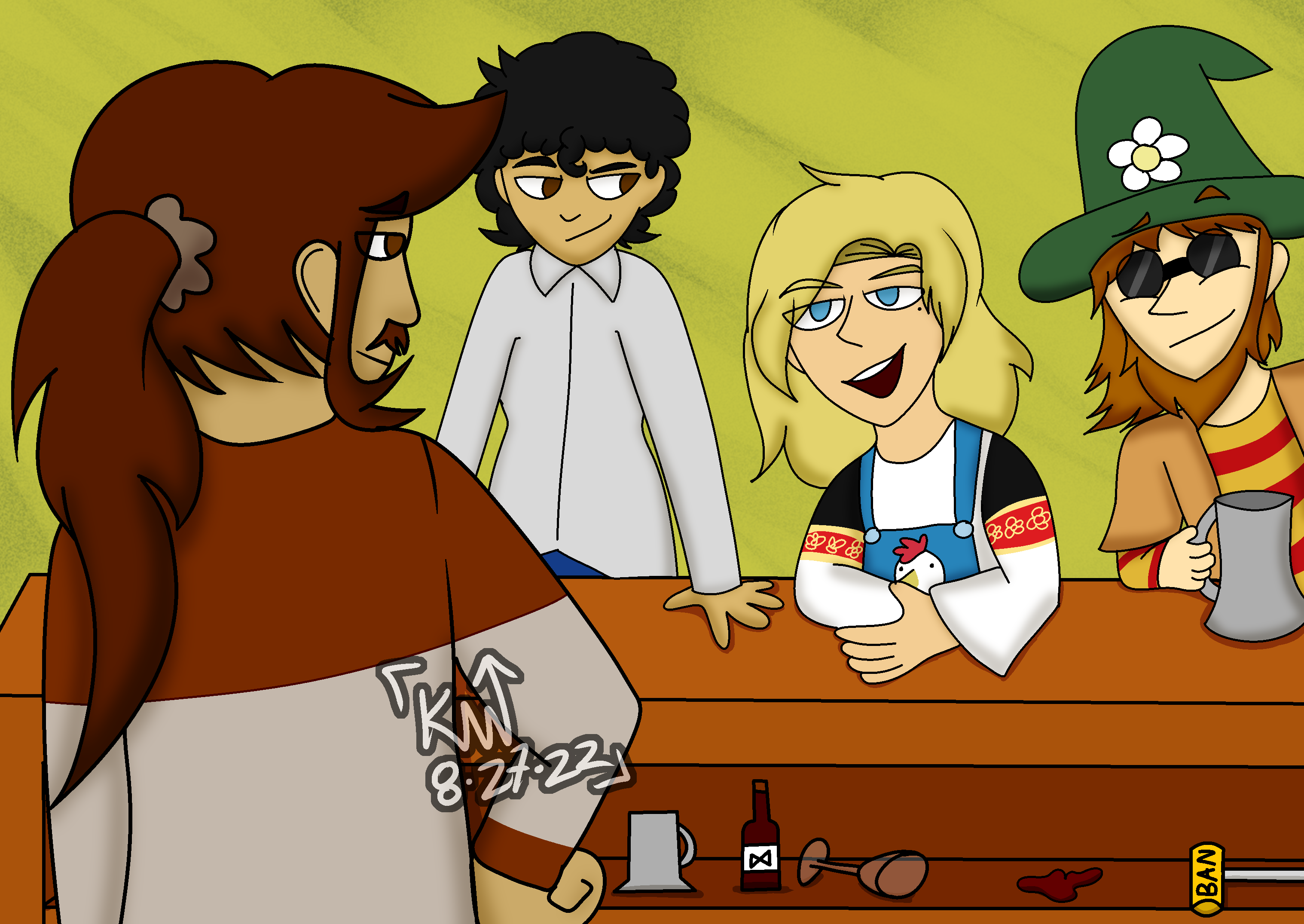 The walk to the bar was quiet, birds idly chirping and flapping overhead as they traveled. The bar, to contrast, was full of life for once. Griffin and Muffy effortlessly slid drinks to each of the patrons; the two bumped into each other in the middle, drawing laughs from the crowd as the three took their spots at the bar.